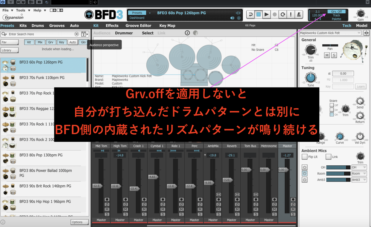 最初、自分が打ち込んでいるMIDIによるリズムパターンとは別のBFD3内部のリズムパターンが再生されることがありました。これは右上にあるGrv.offを適用すると治ります。