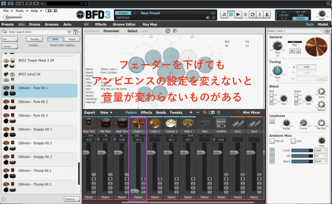 このBFD3内部のフェーダーを触っても音量に変化が出ないというのはバグなのか仕様なのか今でもハッキリしたことが僕の中ではわかっていません。
