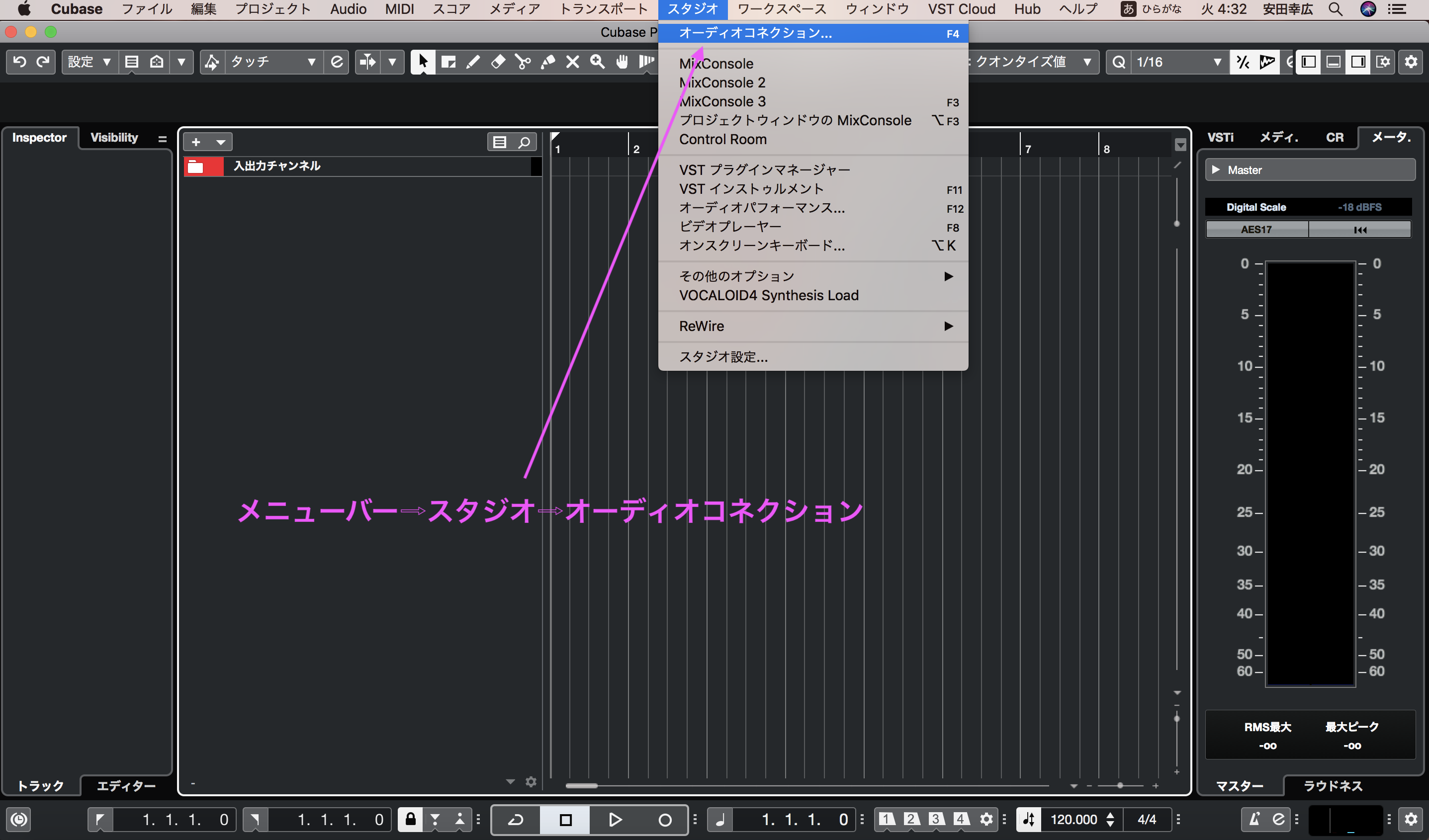 オーディオコネクションを確認します。メニューバー⇨スタジオ⇨オーディオコネクションの順番です。