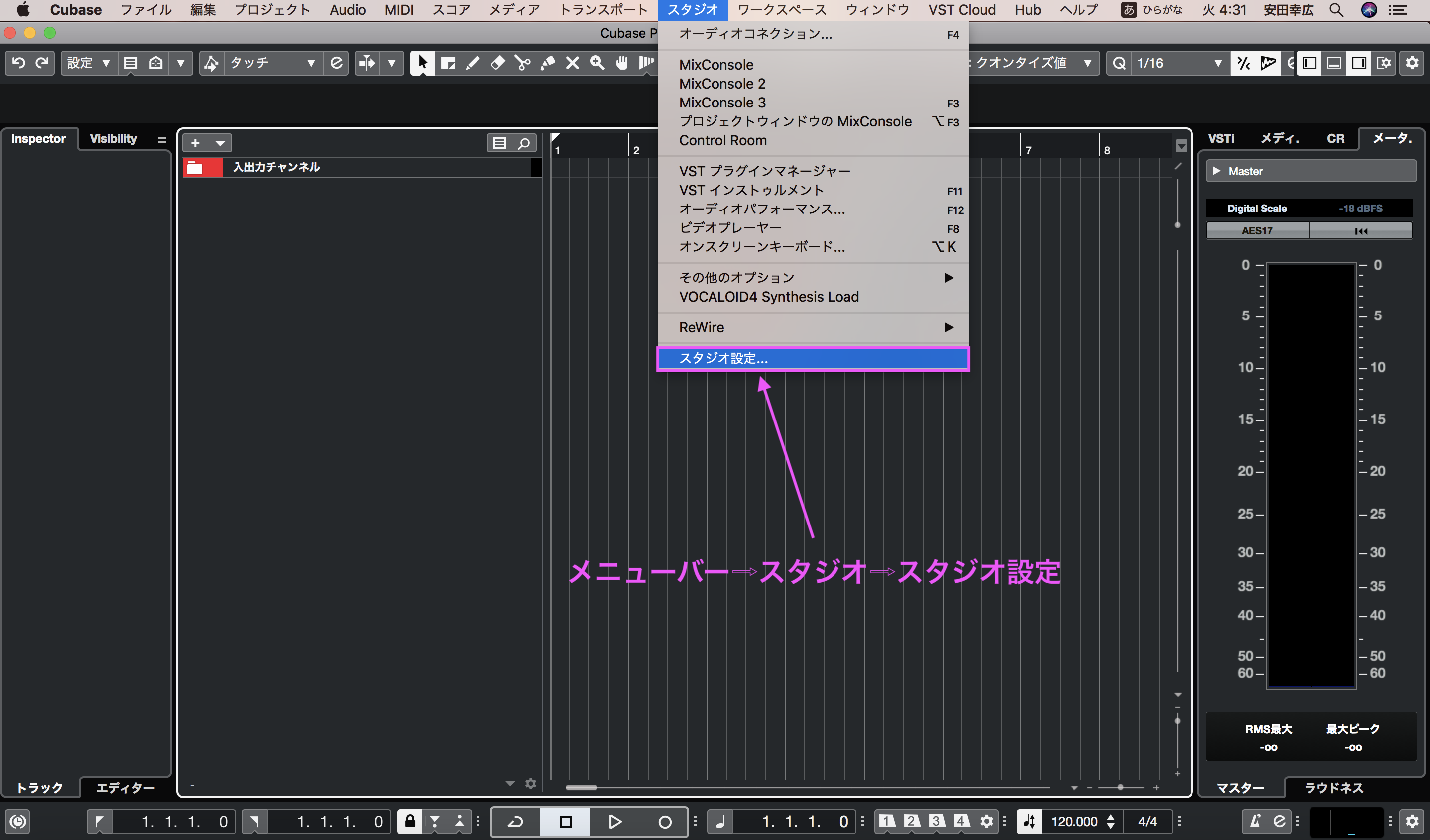 メニューバー⇨スタジオ⇨スタジオ設定で使用しているIFがCubaseに認識されているかを確認します。