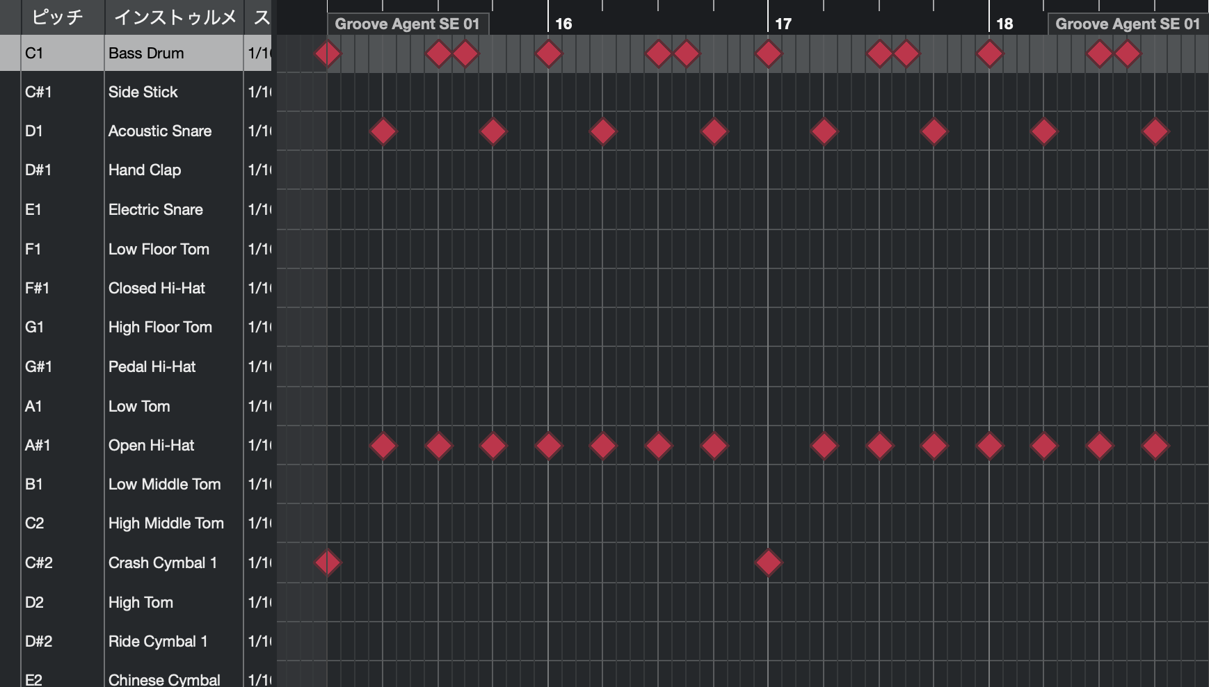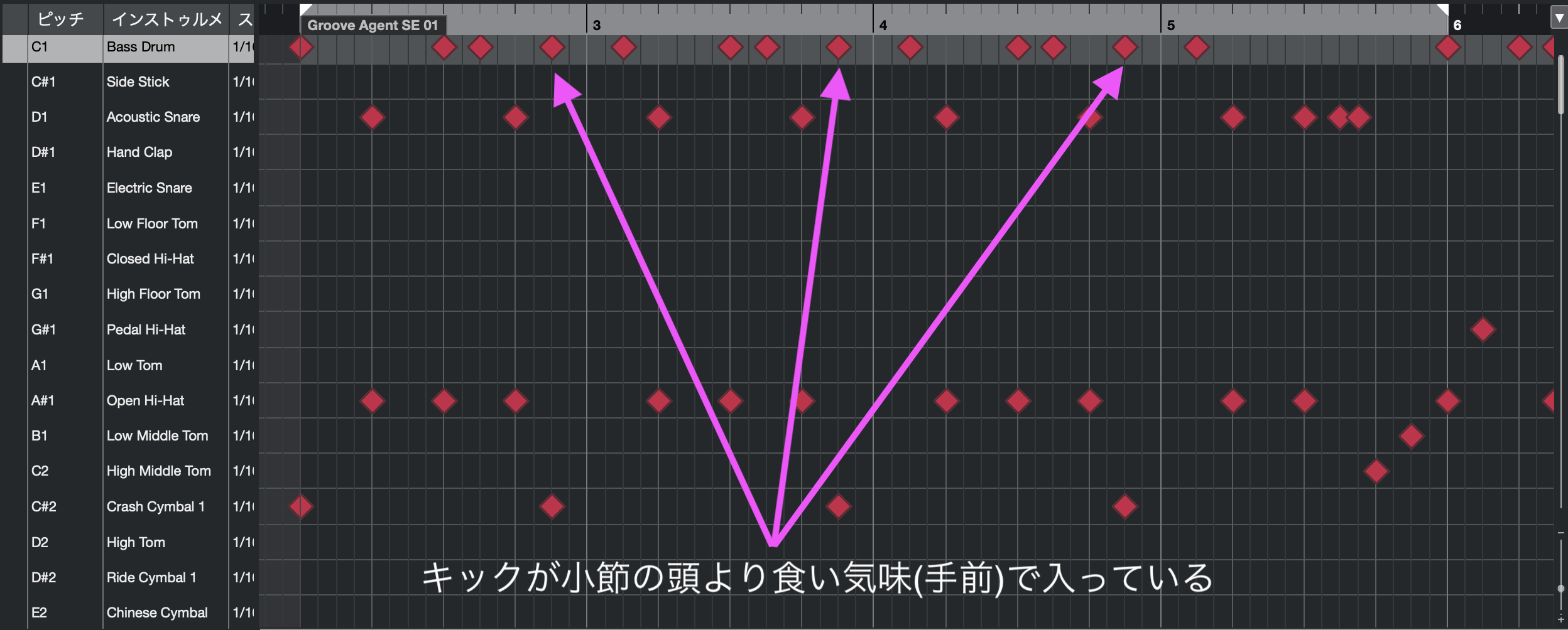 このリズムに少しひねりを加えるためにキックの位置を小節の頭よりも手間に入れました。それがいわゆる食い気味でキックを入れると言うことです。こうすることでリズムに跳ねるような印象がつきます。